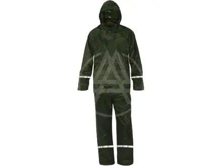 Vode odolný oblek, nohavice v páse do gumy, blúza 3/4 s kapucňou v golieri, zapínanie na zips, nižšia hmotnosť, v praktickom balení.